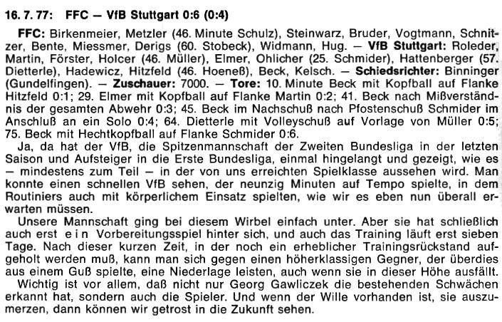 | 16.07.1977 | Freiburger FC - VfB Stuttgart 0-6 | Spielbericht 1; Spielbericht 2; Ergänzungsbericht; Spielszene | |