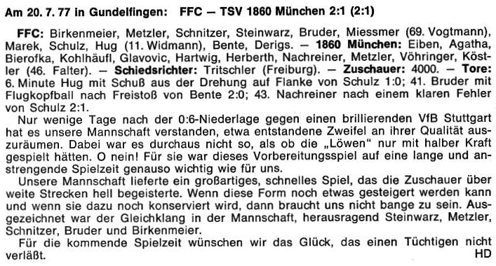 | 20.07.1977 | Freiburger FC - TSV 1860 München 2-1 | in Gundelfingen (Waldstadion); Spielbericht; Kurzbericht | |