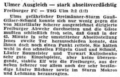 Das Fazit war für die Freiburger Elf, daß in der zweiten Liga ein ungemein frischer und auch rauher Wind weht und daß neben der Technik äußerster Einsatz und auch Kampf die Hauptmerkmale sind. Diese Tatsache demonstrierten die Gäste in bester Weise. Mit dem 2:2 war zwar nicht der erhoffte erste Sieg errungen, aber immerhin ein bescheidener Anfang gemacht, der zu weiteren Taten Anlaß sein sollte.