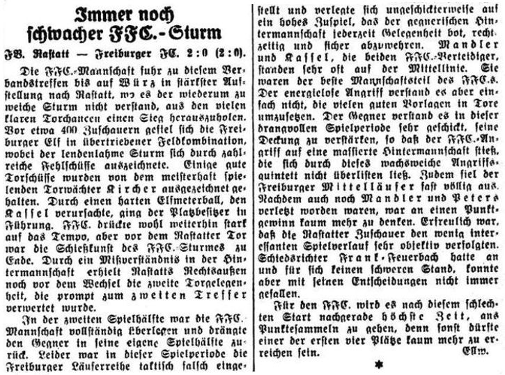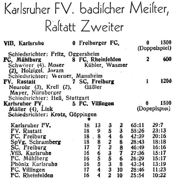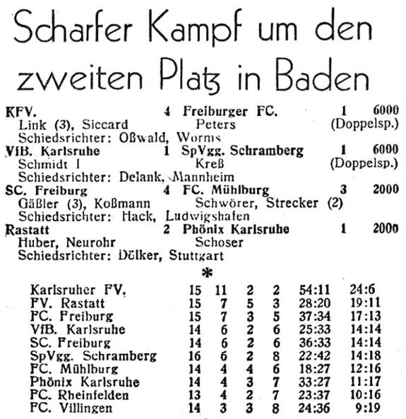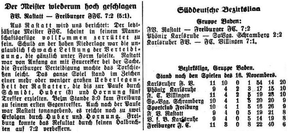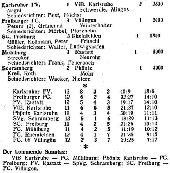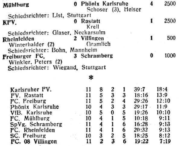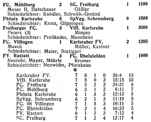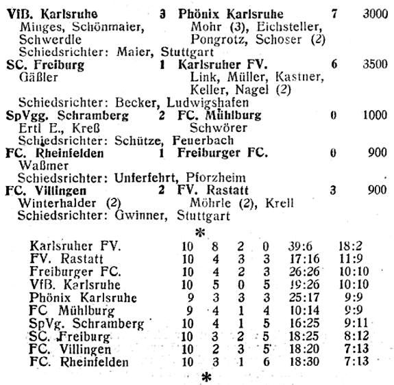 | 11. Spieltag | 16.11.1930 | FV Rastatt - Freiburger FC | 7-2 | Spielbericht 1; Spielbericht 2 |