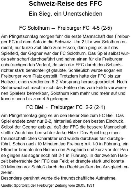 | 24.05.1931 | FC Solothurn (CH) - Freiburger FC | 4-5 | Spielbericht |