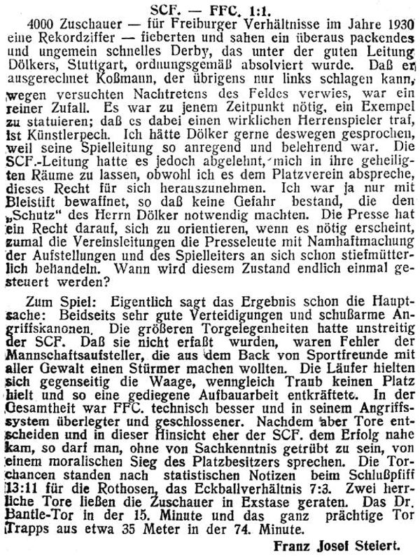| 12. Spieltag | 30.11.1930 | SC Freiburg - Freiburger FC | 1-1 | Spielbericht 1; Spielbericht 2 |